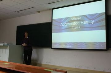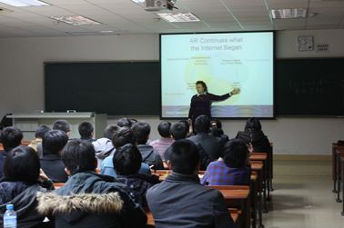 Pereysy形象生动地介绍了增强现实技术的研究历程以及其在工业、娱乐、医学、商业等领域的应用现状和前景,她幽默的言语和丰富的研究经验令同学们兴趣盎然,现场气氛十分活跃。