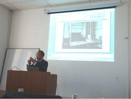访问期间,佐藤诚教授在六号楼401会议室做了题为Research and Development of String-based Haptic Interface –SPIDAR的专题学术报告,介绍了基于线绳驱动的力反馈设备的研究历程以及其在娱乐游戏、工业制造等领域的应用现状和前景。