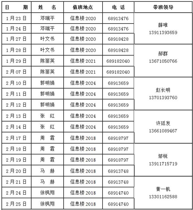 2. 请各位值班老师按时值班,注意各教研室、实验室的安全,如有情况及时向院领导汇报。