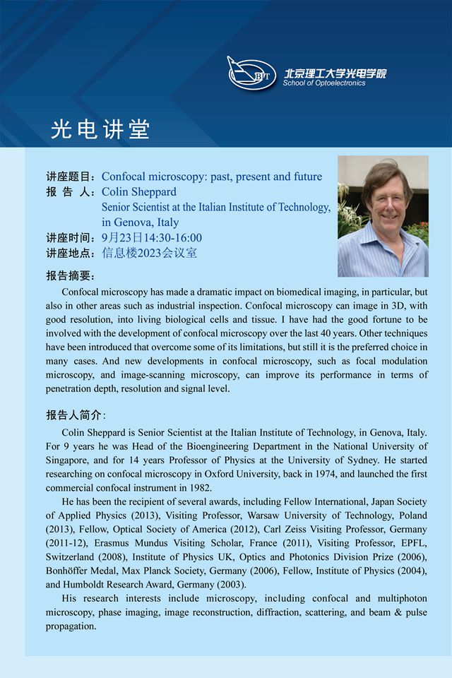 通知公告 通知公告 首页» 通知公告» 学院通知 【讲座预告】Sheppard教授学术讲座 发布日期:2014-09-17 阅读次数: 国际首台商用共焦显微镜的构建者及其理论体系的建立者Sheppard教授来我院进行学术讲座 分享到: